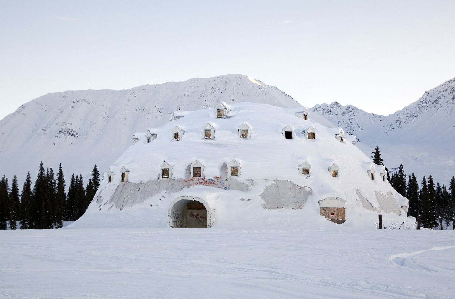 На Аляске есть город-иглу – довольно причудливое строение. Оно могло бы служить отелем, но стало военным объектом времён холодной войны. Построенное из бетона здание своей формой напоминает иглу. Строить его начали в 1970 году, однако не были соблюдены строительные нормы. Предполагалось, что там будут жить туристы в летнее время года, однако следующий владелец решил использовать здание в качестве аттракциона. Но и это не принесло доход. В 2005 году предпринята попытка возродить здание, сделав из него придорожную лаку сувениров, но и она закончилась неудачей. Постепенно вандалы разрушают постройку, превращая её в руины. Сейчас в этом месте можно столкнуться с дикими хищниками Аляски, которые прячутся за стенами Иглу Сити.