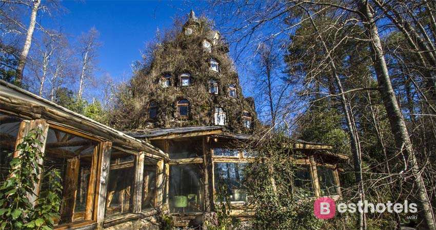 Забавный и магический отель располагается на горных массивах, в биосферном заповеднике взятом под охрану ЮНЕСКО – Уило-Уило. С виду силуэт отеля напоминает жерло заброшенного вулкана, из которого вытекает вода. В случае если бы не здоровенное панорамное застекление, отель сливался бы с красотой лесного мира. Есть только один способ попасть в этот необычный отель – это небольшой навесной мост. Из нескольких номеров раскрывается удивительный вид на вулкан. И он кстати является действующим. Но как только попадаешь внутрь, то понимаешь, что попал в настоящий рай. В мир люкса, престижа и роскоши. Отдельно стоит отметить интерьер ванных комнат, которые вырубленные из целикового куска дерева.