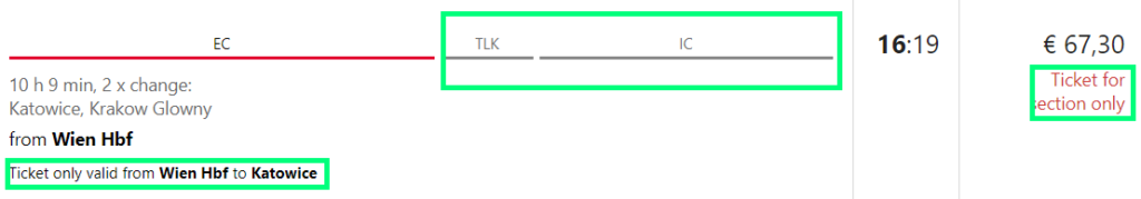 - Бывает, что сайт может предложить вам один маршрут, но входить в стоимость вашего билета будет лишь его часть. Т. е. часть билета нужно будет покупать как-то отдельно. Так бывает, когда определенную часть маршрута обслуживает компания, которая не может продать билет через австрийскую ж/д. На примере ниже видно, что часть маршрута (два поезда из трех) отмечена серым и в двух местах написано, что он действителен только для части маршрута. Под ним для сравнения обычный билет на весь маршрут, где все части маршрута цветные.
