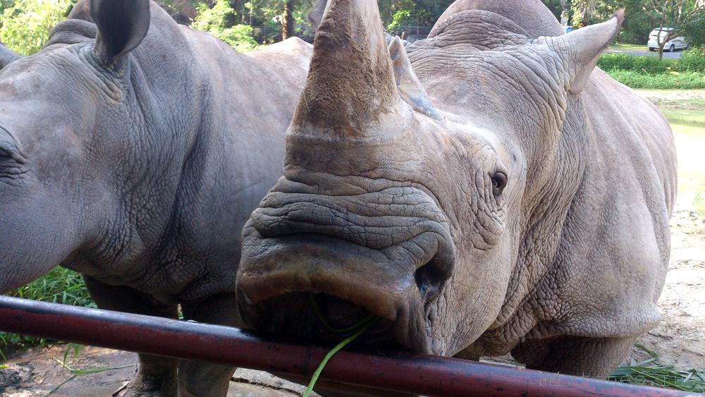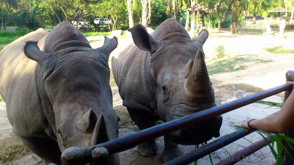 Чтобы покормить носорогов, нужно купить прямо на месте специальную траву. Толстокожие гиганты с энтузиазмом уплетают ее прямо из рук.